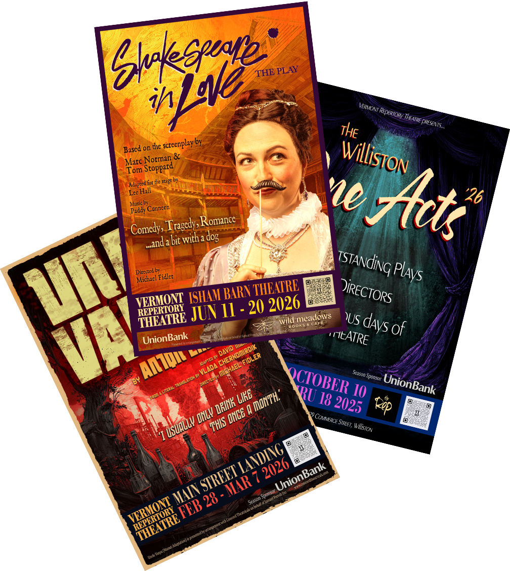 Season 2026 is our most ambitious Season to date, with Anton Chekhov’s Uncle Vanya at Main Street Landing in Burlington, Tom Stoppard’s Shakespeare in Love at the Isham Barn in Williston, as well as our very own Williston One Acts, at our home, The Rep.